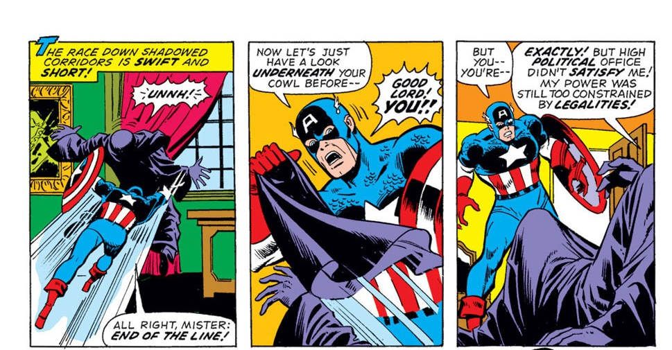For instance, I will never forget the “Secret Empire” storyline (the Watergate scandal of the Marvel Universe), in which Cap finds out corruption at the White House, leaves his role as the patriot hero and becomes a new superhero, the Nomad! An adventure for the ages and heavy stuff for a kid’s “funny book” in the 1970s!