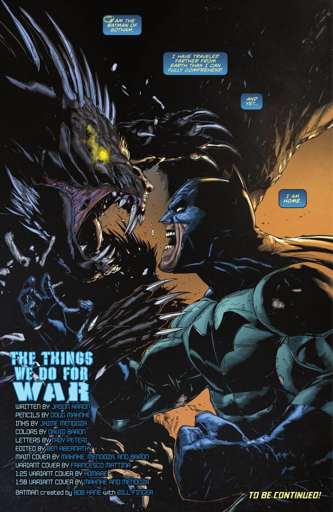 Aaron does a very competent job of taking the mostly urban character of Batman and throwing him into a science fiction scenario that would probably be more appropriate for Superman. The story never slows down; there are enough twists to keep the reader constantly engaged, along with strong characterization and consistently exciting action sequences—the latter due in large part to the remarkable skills of penciller Mahnke and the colors of veteran David Baron.